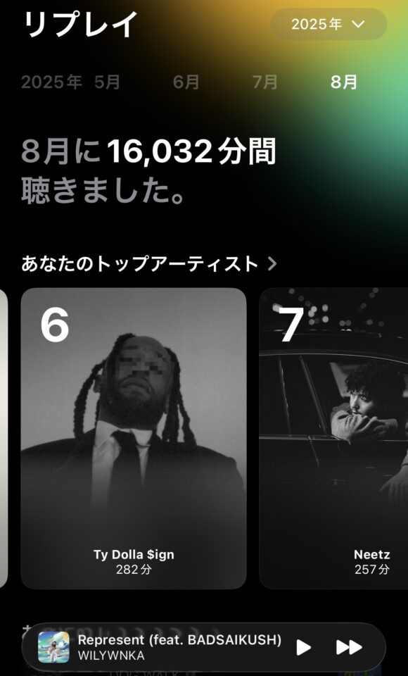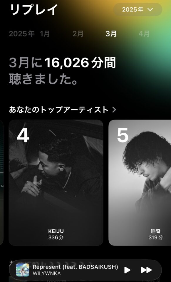 その証拠に、2025年は「Apple Music」だけで月平均で11604分再生していました!1日で換算すると、約387分、つまり平均で1日に6時間半は再生していたということなんですね!